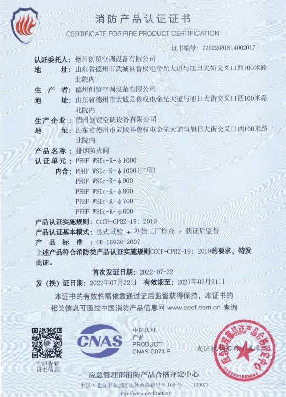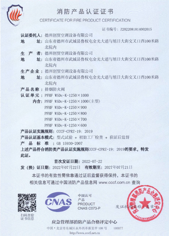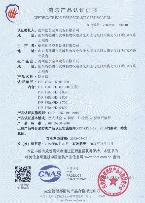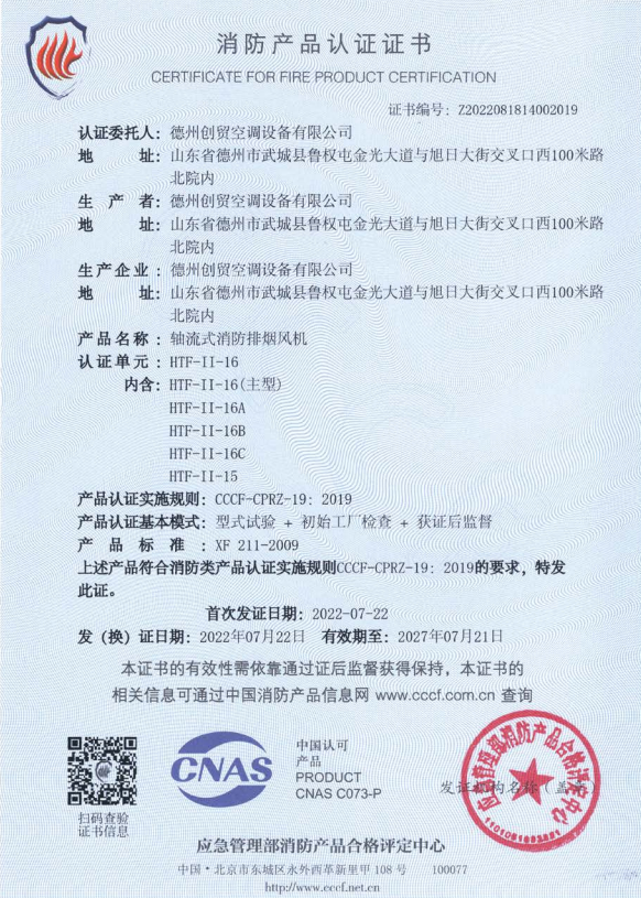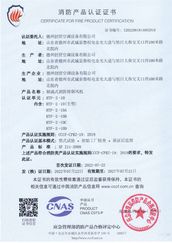德州創貿空調設備有限公司坐落于山東省德州市武城縣魯權屯鎮通風/空調設備產業園,注冊資金1000萬元,是以研發、生產、銷售、cccf消防排煙風機、閥門,中央空調通風系統產品為核心業務的現代化企業。 公司不斷升級生產設備,引進新型工藝及流程,產品各項檢測貫穿整個生產環節,產品在原材料采購、設計、制造、檢測、各個環節均嚴密受控,各個部件均嚴格按照國家標準以及行業標準。企業以市場為導向,聘請著名科研院校對我公司進行技術指導。售后服務以“快速、優質、滿意”為服務宗旨,逐漸形成全國范圍內的售后服務專線,滿足廣大客戶的需求! 公司真誠希望同社會各界朋友共同發展,合作共贏!